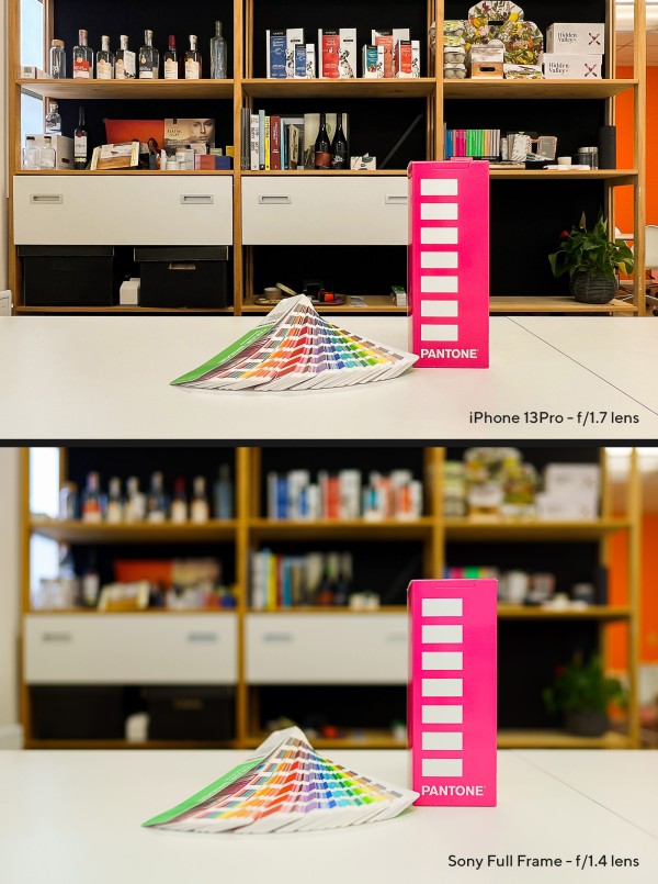In addition to the above technical comparison, the glass that’s in front of the sensor plays a huge role in the quality and feel of an image. Let's say a phone offers a 24mm field of view by default with an aperture of f/1.7. We can compare that to a full frame camera with a 24mm lens with an aperture of f/1.4. We're looking for a sharp focal point, and then the nice fall off to the out-of-focus areas of the image. The lens quality with larger elements of glass will always look better and creamier, particularly when paired with the much larger sensor size. And before you say it, no, it's not the same as a digitally generated portrait mode. See the comparison below as an example.